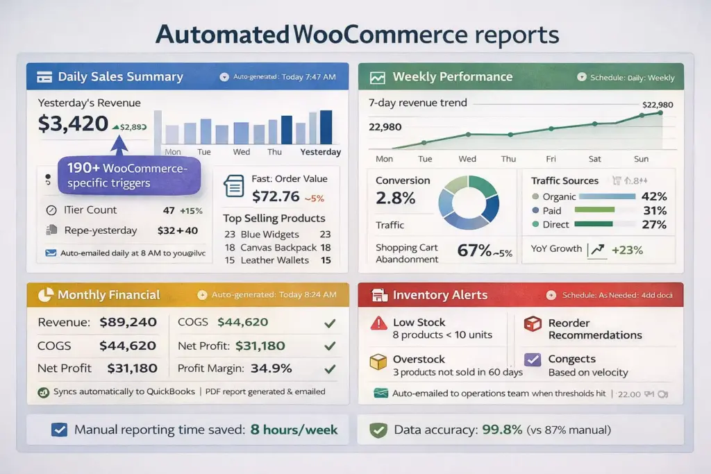 That’s the counterintuitive truth about WooCommerce automation: the ROI isn’t in time saved. It’s in what you do with that time. Sarah spent her recovered 23 weekly hours on content creation, influencer partnerships, and customer experience improvements. Activities that actually grow revenue.