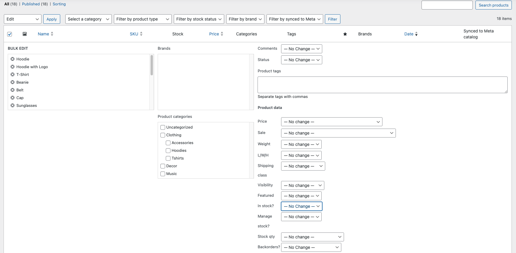 - You can change stock status (in stock/out of stock) in bulk, but not stock quantities