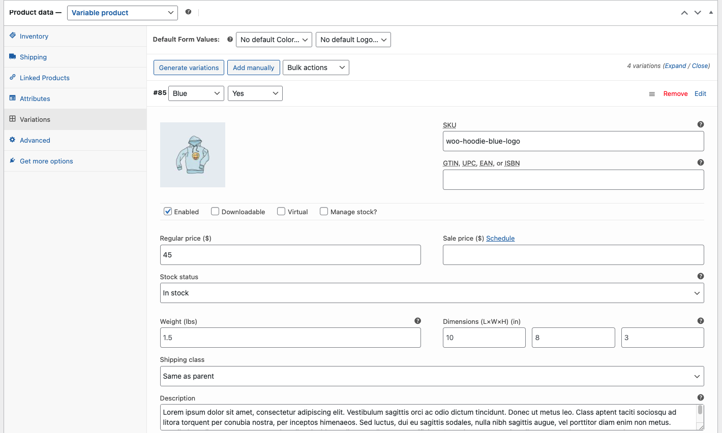 If you sell products with variations (size, color, material), each variation has its own inventory settings.