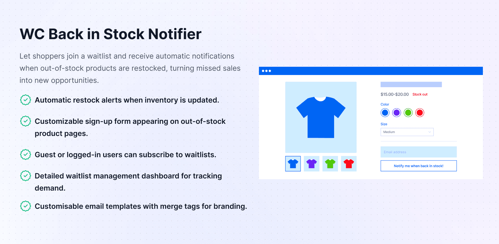 The plugin works like a built-in line for your shop. Shoppers sign up with one click, join waitlists, and get friendly reminders when products return.