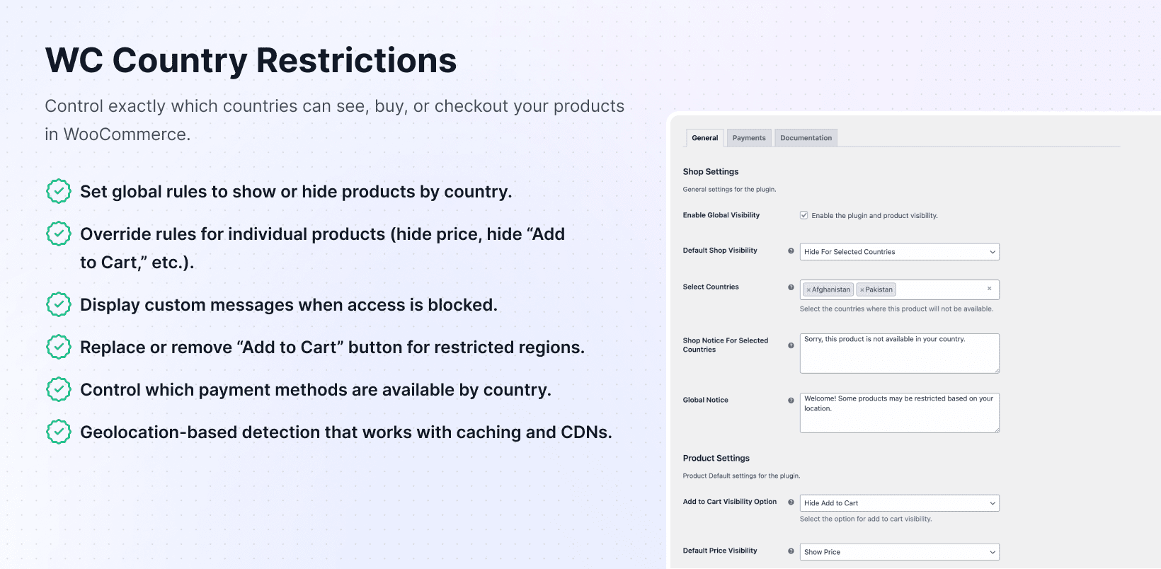 Setting up country-specific restrictions happens through familiar WooCommerce settings with new geolocation-based visibility controls and payment method options.