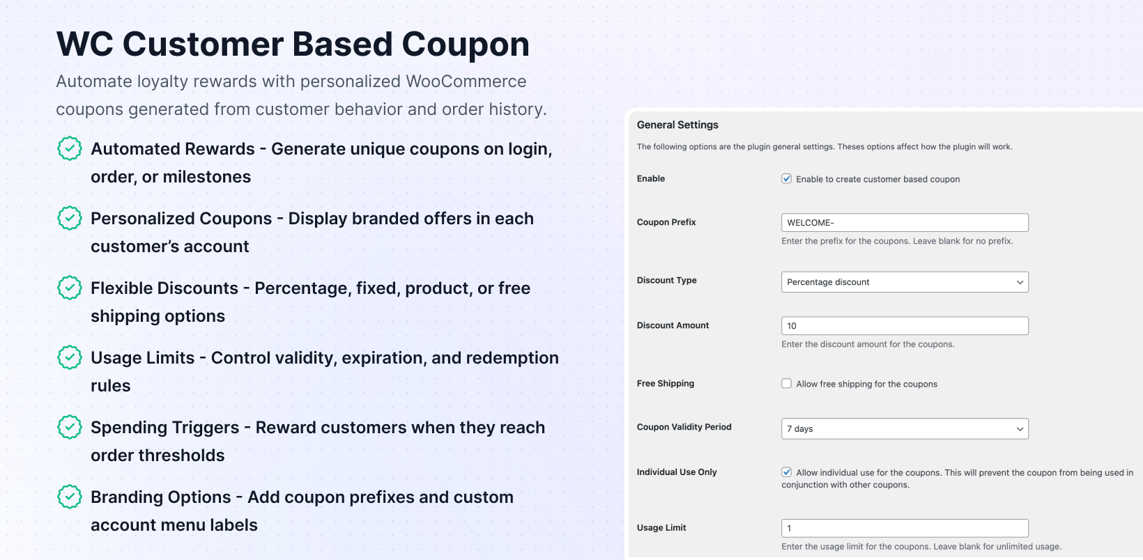 Enable the plugin in Marketing → Customer Based Coupon → General Settings and choose triggers like first purchase, login, or minimum order amounts. Unique codes generate automatically using your specified discount settings and appear in customer accounts.