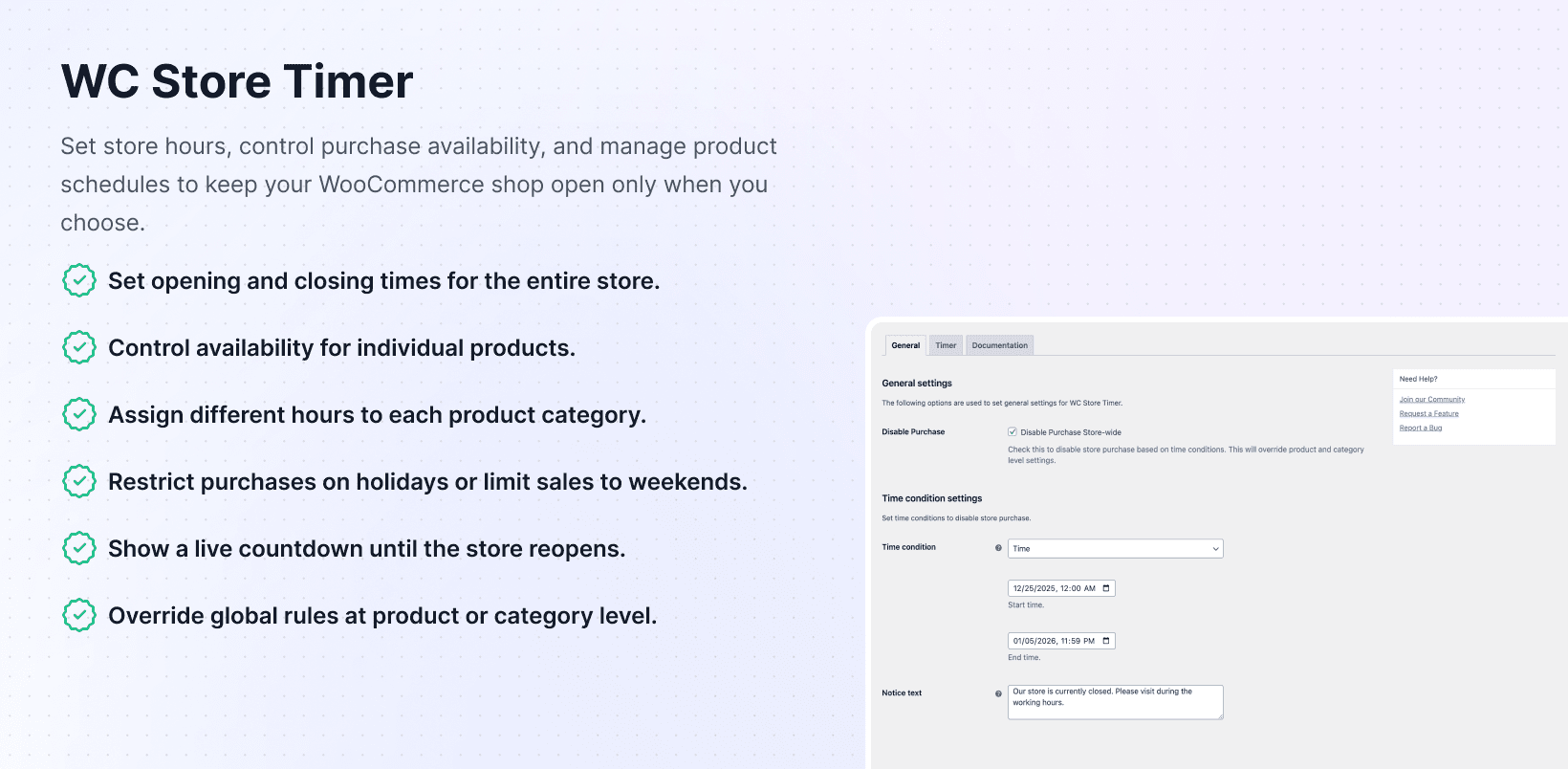 This WooCommerce store timer plugin targets store owners who need to control their buying windows. If you run bakeries that take orders only during the daytime, sell event tickets that go live at specific times, or need compliance to prevent holiday sales, WooCommerce alone doesn’t offer ways to enforce those rules.