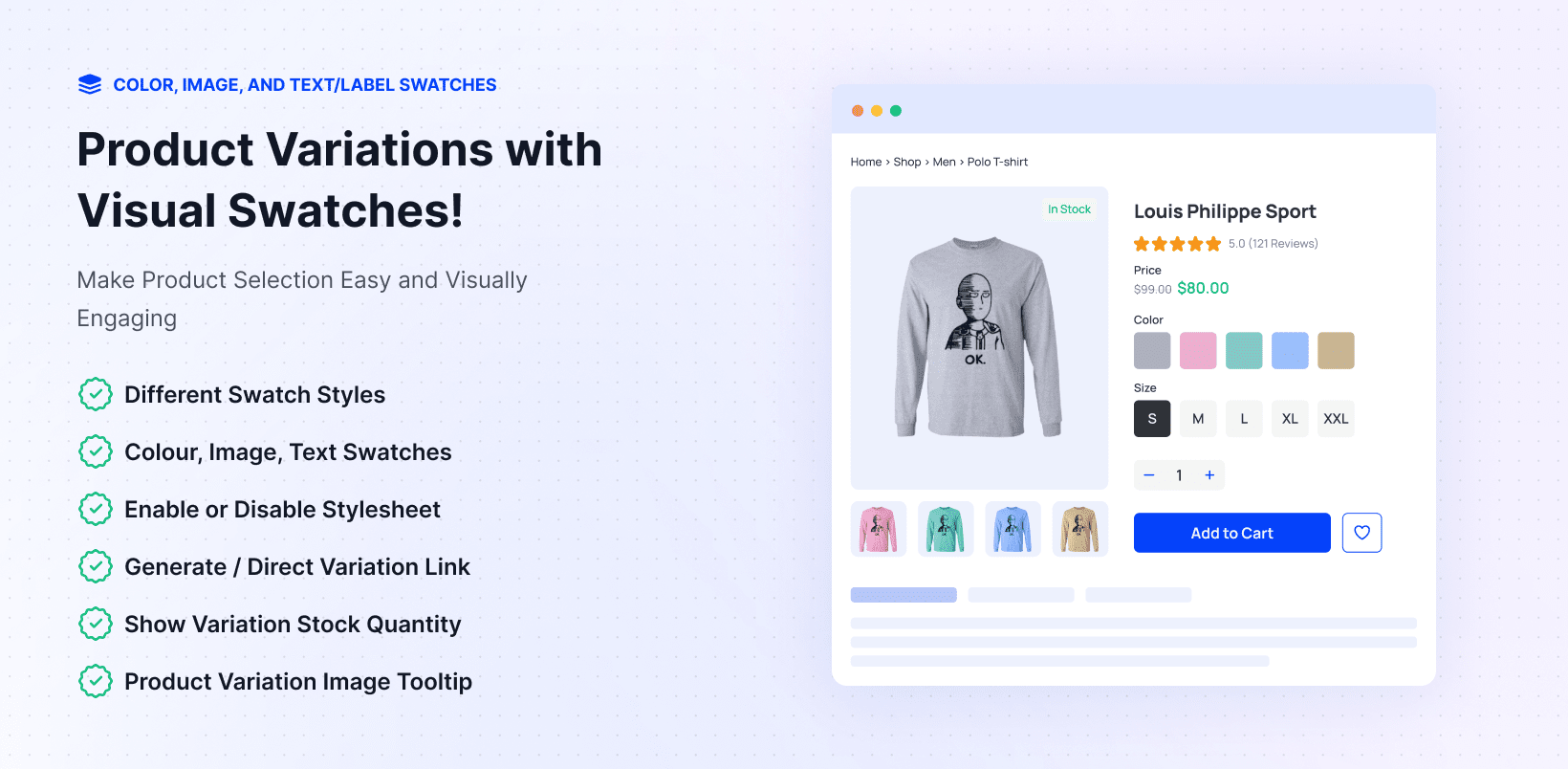 Product Variation Swatches replaces WooCommerce’s standard dropdown menus with visual swatches that shoppers can click. Instead of scrolling through plain lists, customers can instantly see colors, patterns, or sizes before making a choice. This helps them decide quickly and gives your store a polished, professional look.